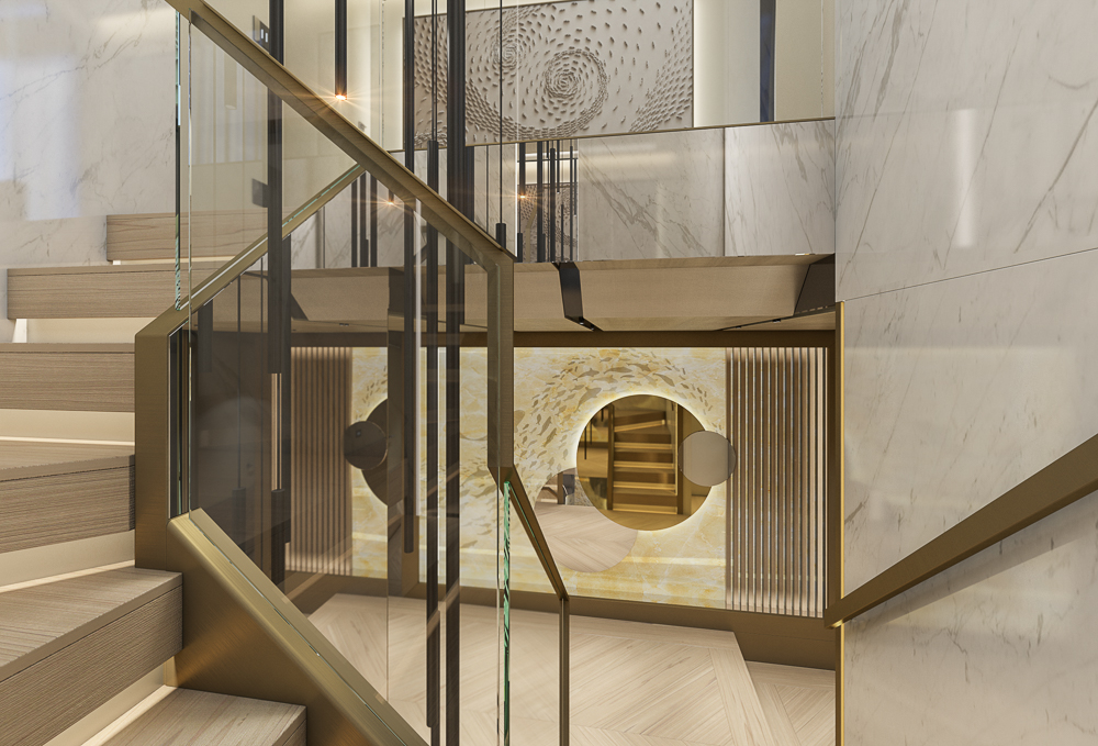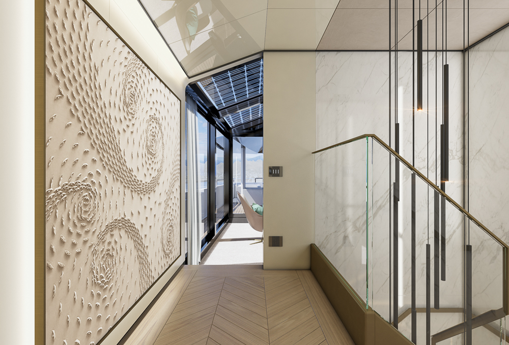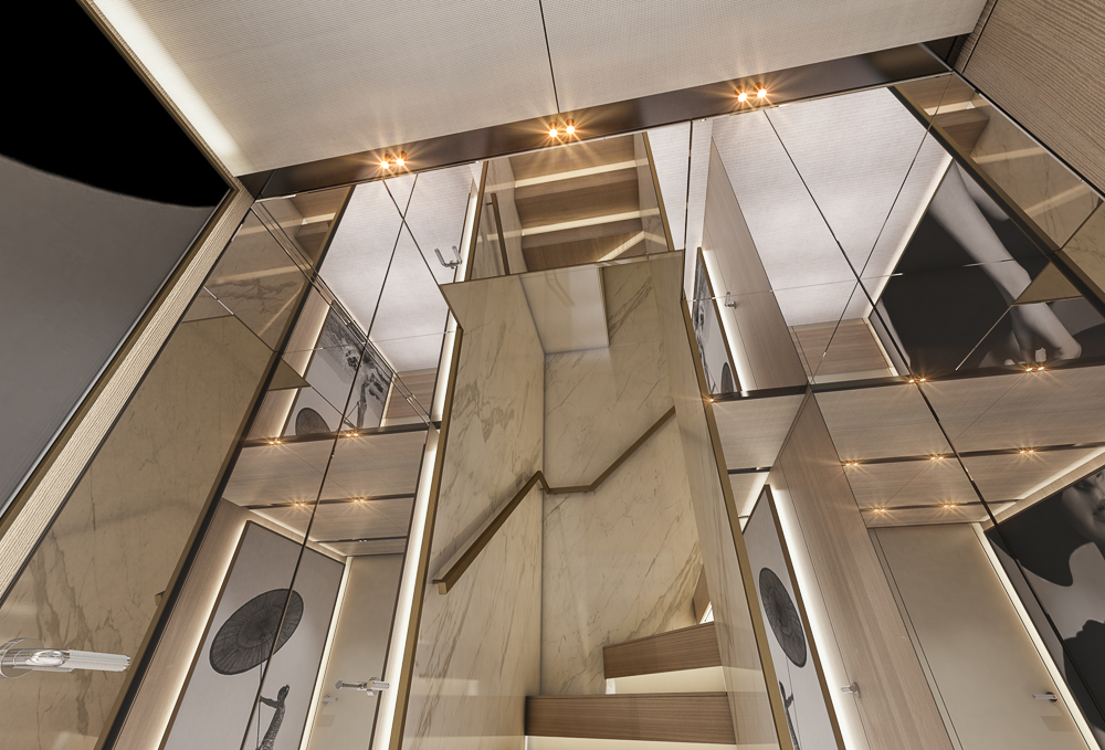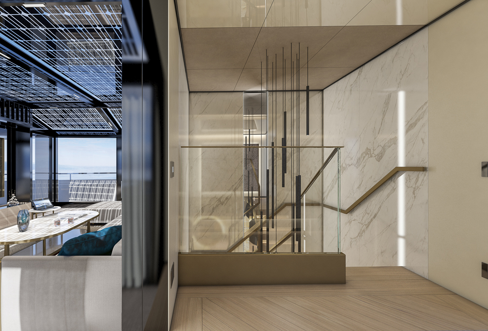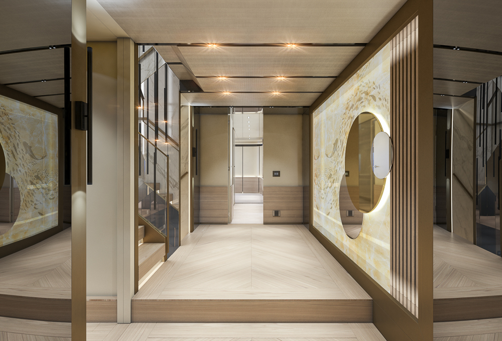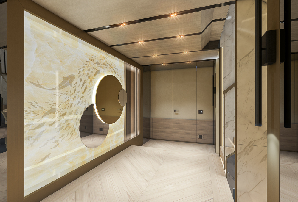 “The arch is a very strong feature, a distinguishing trait of ARCADIA’s A range,” adds Lumini. “Arches matching the main one have been included on the decks, to bring to mind the exterior line when standing inside. I am referring in particular to the lobbies and stairs, which are very important areas to valorise on the A115.”