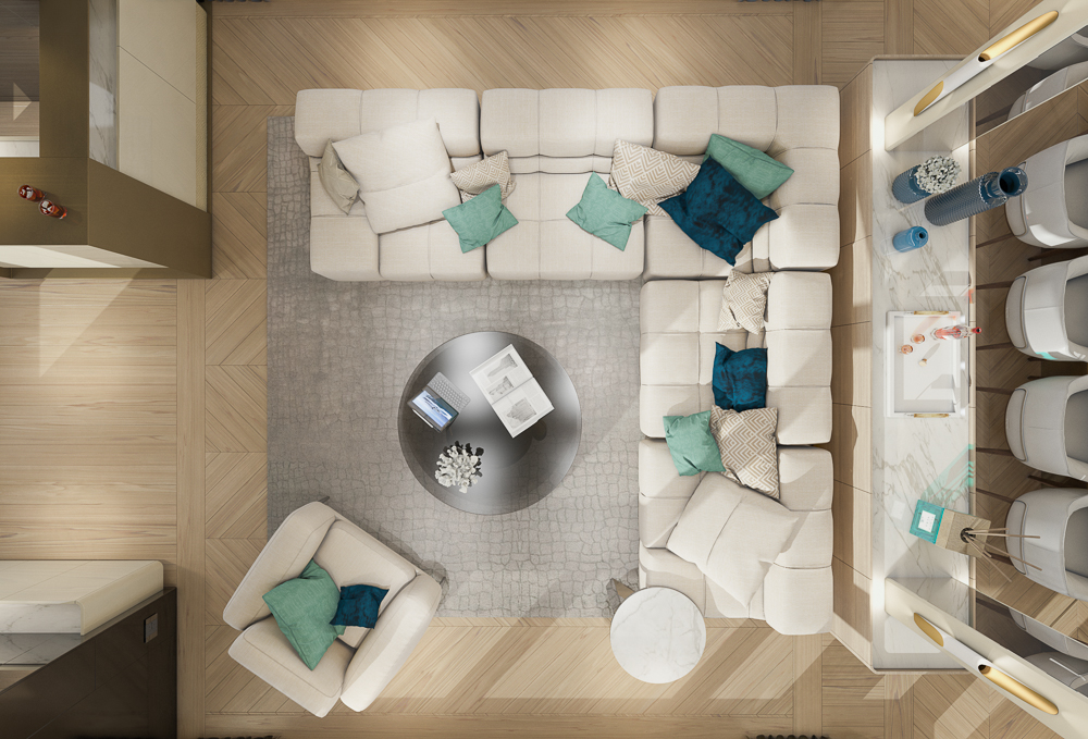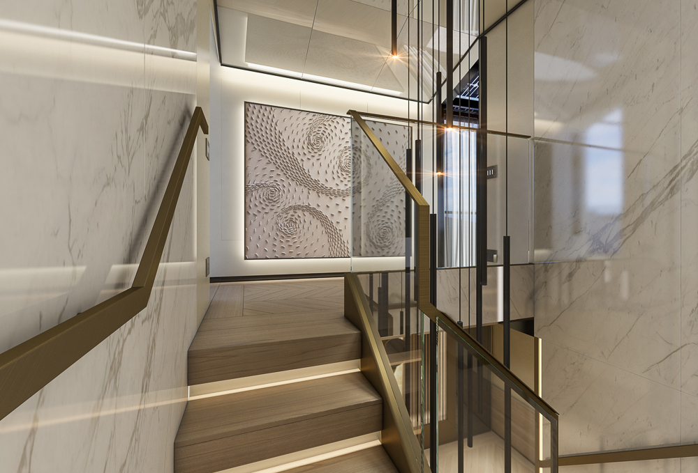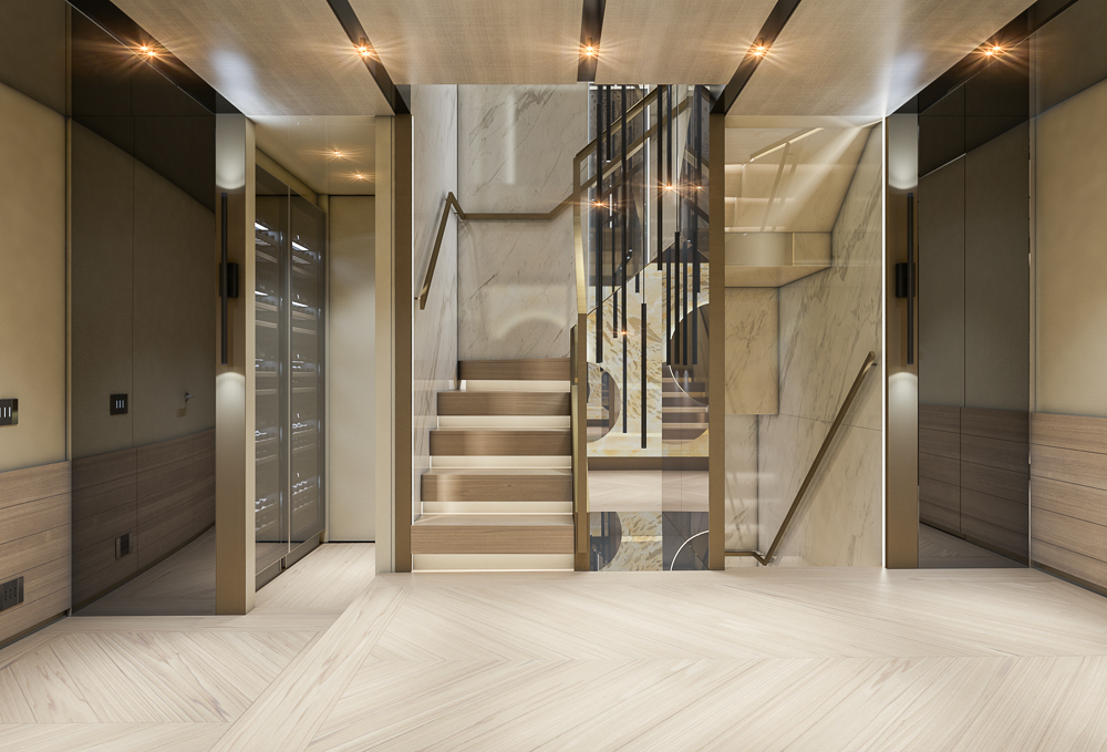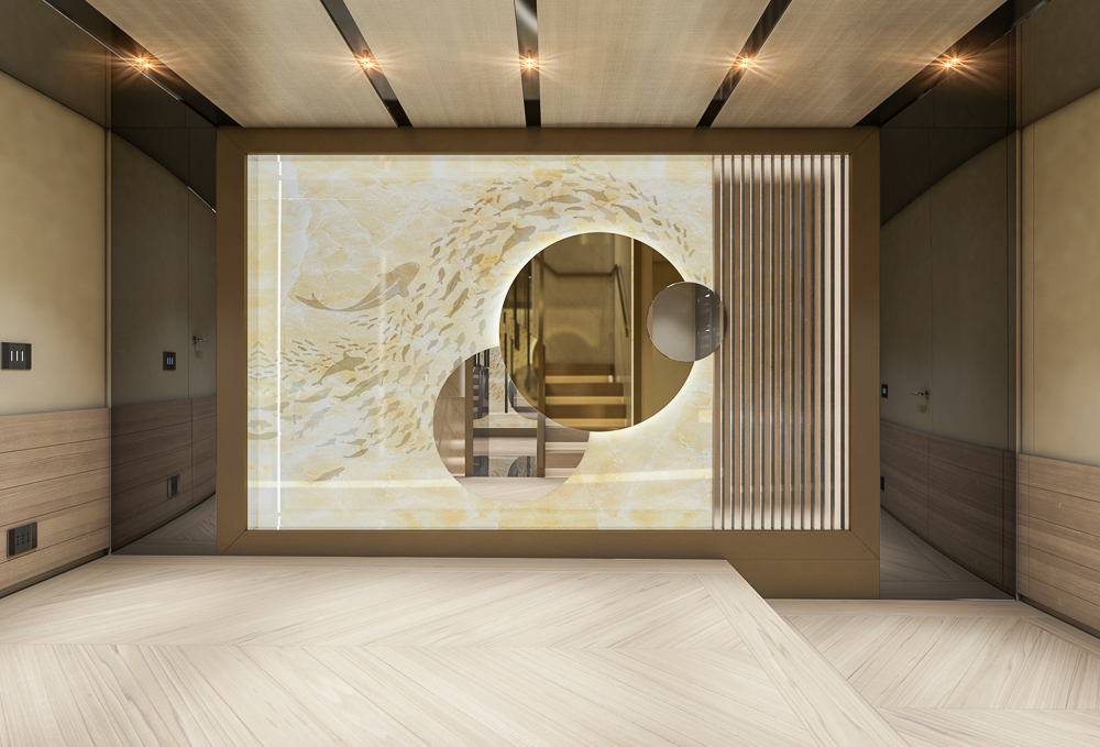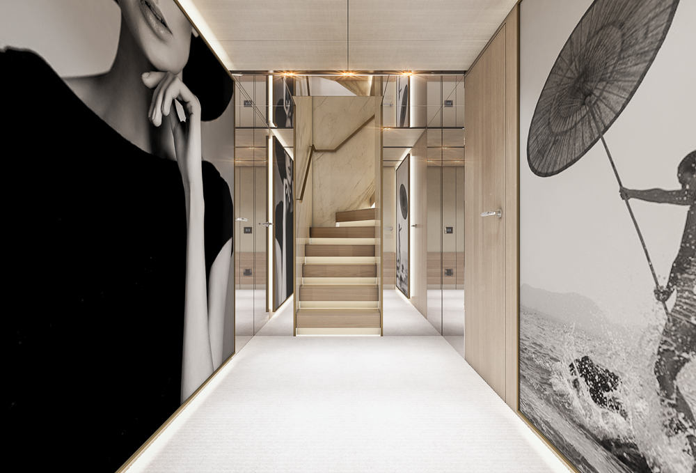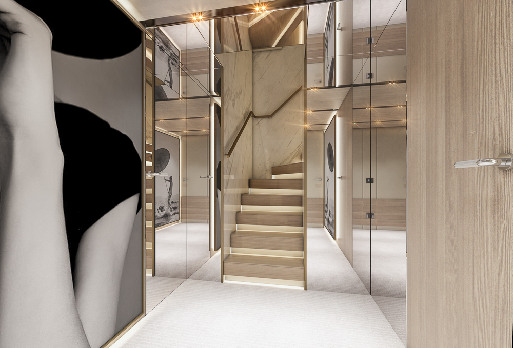 “The arch is a very strong feature, a distinguishing trait of ARCADIA’s A range,” adds Lumini. “Arches matching the main one have been included on the decks, to bring to mind the exterior line when standing inside. I am referring in particular to the lobbies and stairs, which are very important areas to valorise on the A115.”