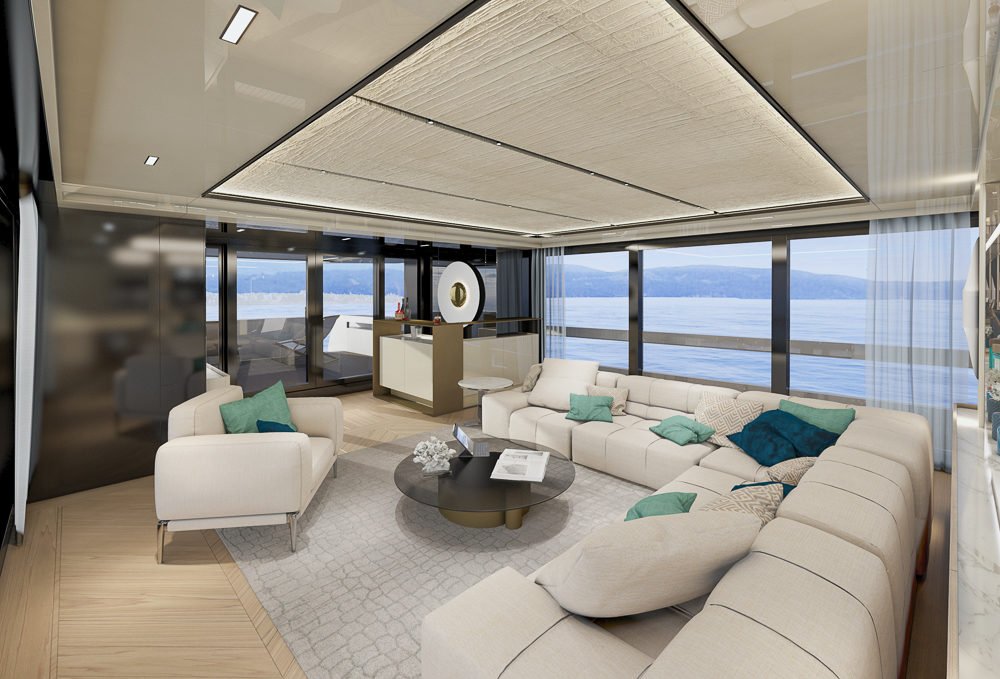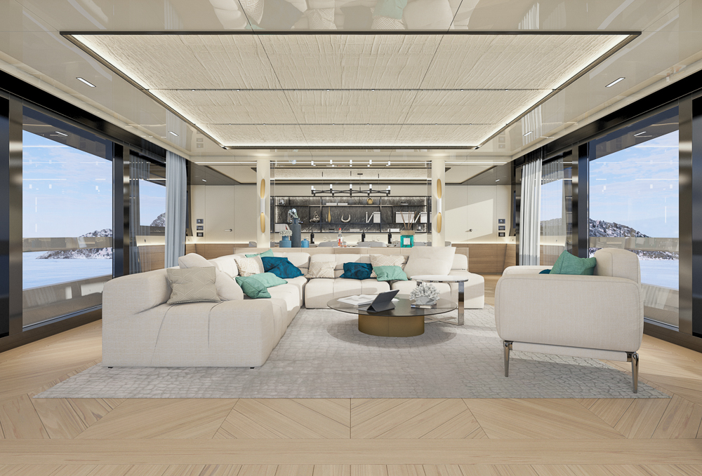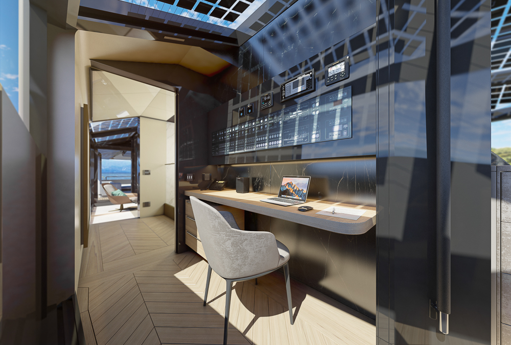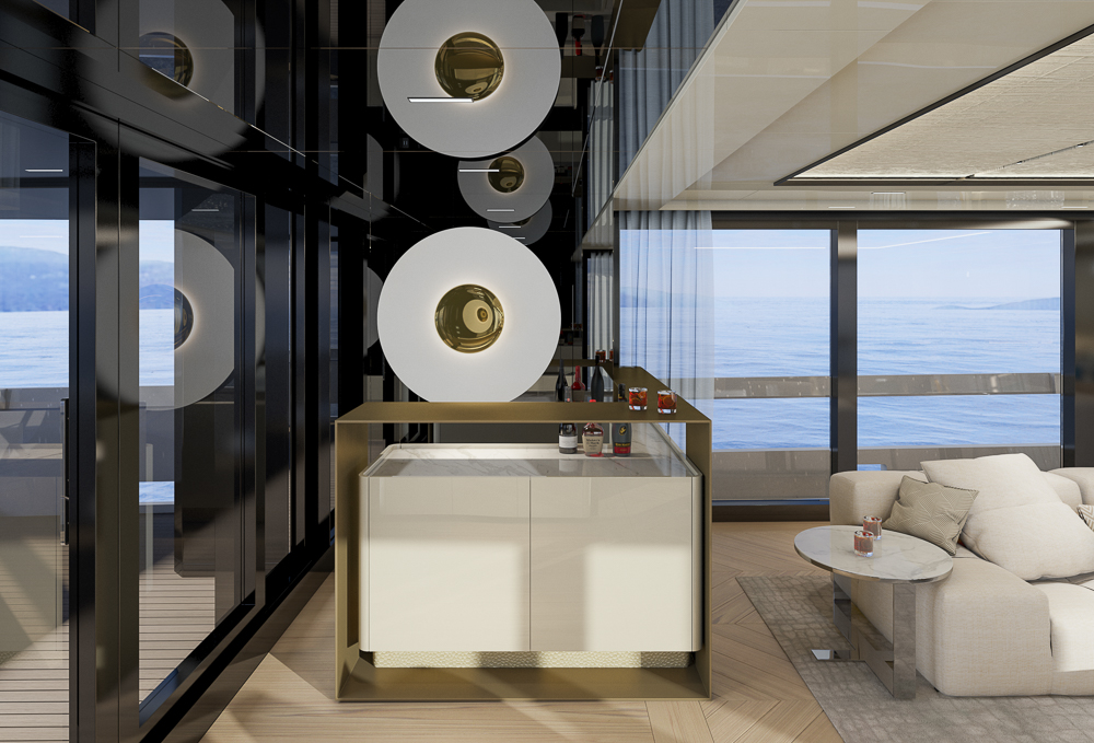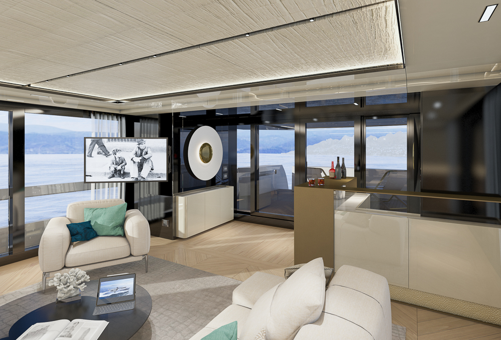 “If we were to make just two examples, we could pick the jardin d’hiver on the upper deck and the arch that connects the aft and stern of the yacht” explains Enrico Lumini, from Hot Lab. “In the jardin d’hiver we worked so that the transparency clearly perceived when viewing the A115 from outside can be experienced inside as well. We achieved this with low furniture items concentrated inside the volume, away from the uprights and the large windows. Even for large elements, such as the 75” TV, we found solutions that reduce the visual impact as much as possible, such as hanging solutions.”