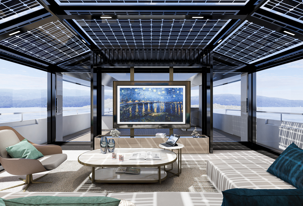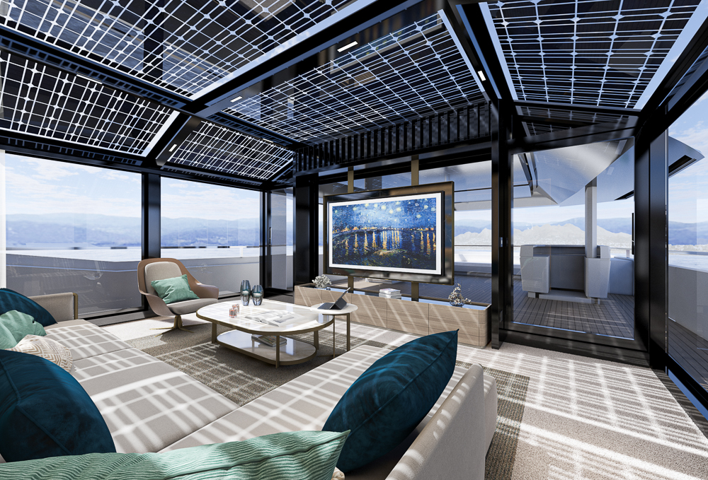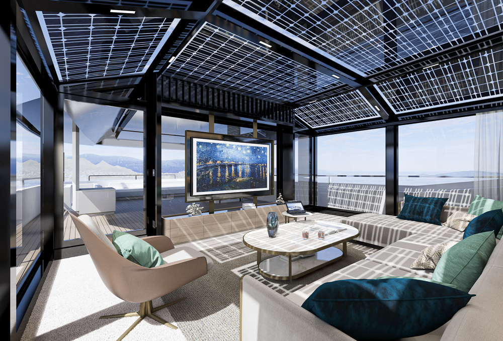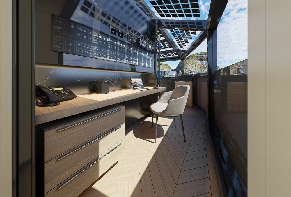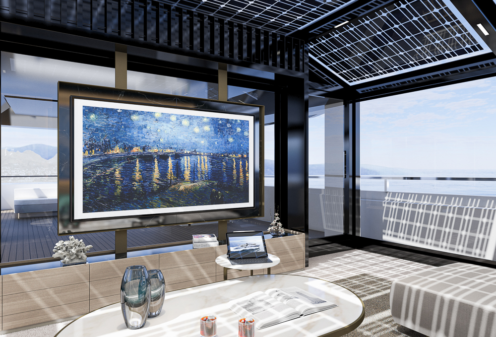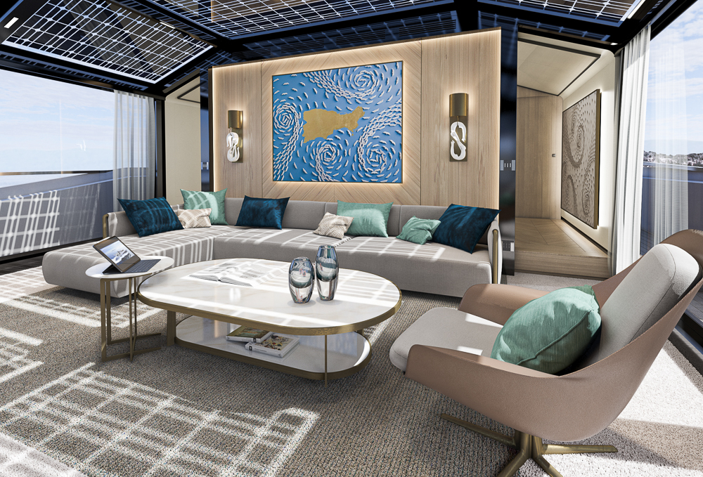 “If we were to make just two examples, we could pick the jardin d’hiver on the upper deck and the arch that connects the aft and stern of the yacht” explains Enrico Lumini, from Hot Lab. “In the jardin d’hiver we worked so that the transparency clearly perceived when viewing the A115 from outside can be experienced inside as well. We achieved this with low furniture items concentrated inside the volume, away from the uprights and the large windows. Even for large elements, such as the 75” TV, we found solutions that reduce the visual impact as much as possible, such as hanging solutions.”