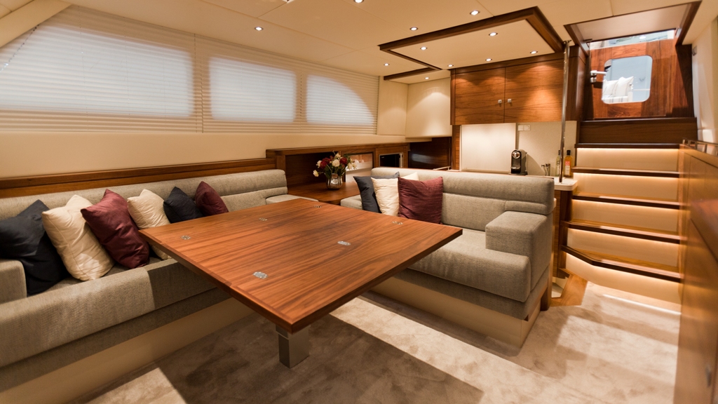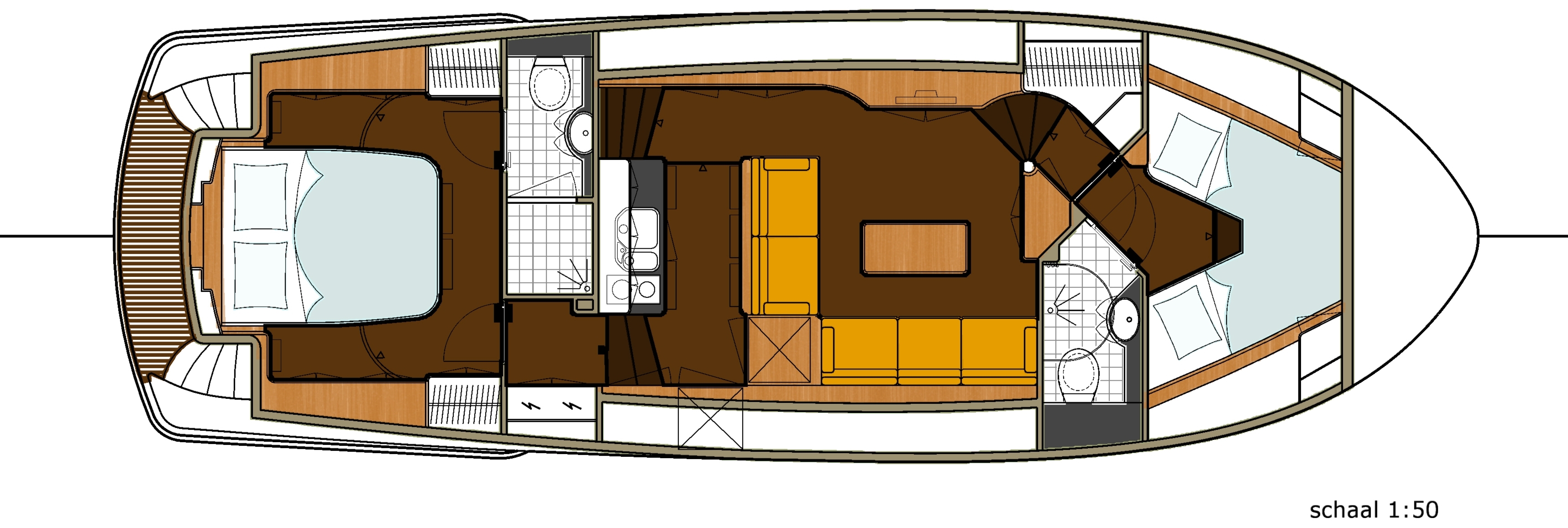 Jirnsum –De Boarnstream will present her newest models Retro Line at boot 2012 Düsseldorf: Boarncruiser 42 Retro Line – Aft Cabin (nominated for European Powerboat of the Year Award 2012) and the Boarncruiser 46 Retro Line – Cabrio (first time to be seen in Germany).On request of many customers De Boarnstream has developed a more compact model of the successful Boarncruiser Retro Line (50-72 ft). With the Boarncruiser 42 Retro Line – Aft Cabin De Boarnstream has put an yacht in the top section on the market.This new 42’ Aft Cabin is seamlessly connecting into the Retro Line series. A distinguished and stylish yacht with royal tulip bow, with dimensions 12.85 x 4.30 x 1.15 m and deliverable with single screw as well as double screw. CE-classification: B. Especially the interior design is outstanding: a large owner’s cabin in the stern, a guest cabin in the front and a pantry and saloon amidships and yet at the same level: a real family yacht par excellence! The stylish interior design is emitting warmth and affection. The lay-out is very comfortable, all the comfort-elements are situated amidships. The Yachtfloor heating system and double glass are standard and this combination makes the stay aboard a very pleasant one.The steering qualities have got an extra dimension because of the heavy version of bow and stern thruster. The stabiliser system has been prepared.