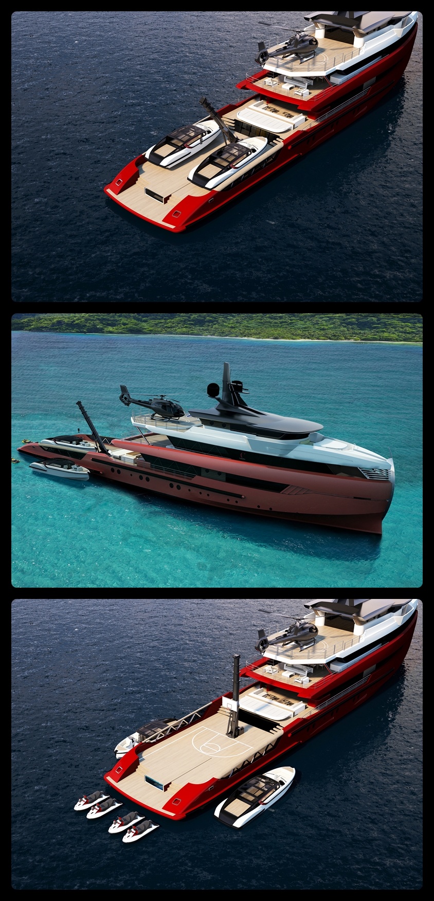 The vessel’s extra-large volumes are clearly devoted to the largest beach area ever (200smq on 3 levels) and all kinds of sea-toy storage. The aft level opens directly over the sea with the possibility of hosting up to two 12m tenders. Four jet skis, a submarine or several motorcycles could be hosted in the lower garage together with inflatables or other toys. A bow garage guarantees space for an additional tenders and sea-toys.