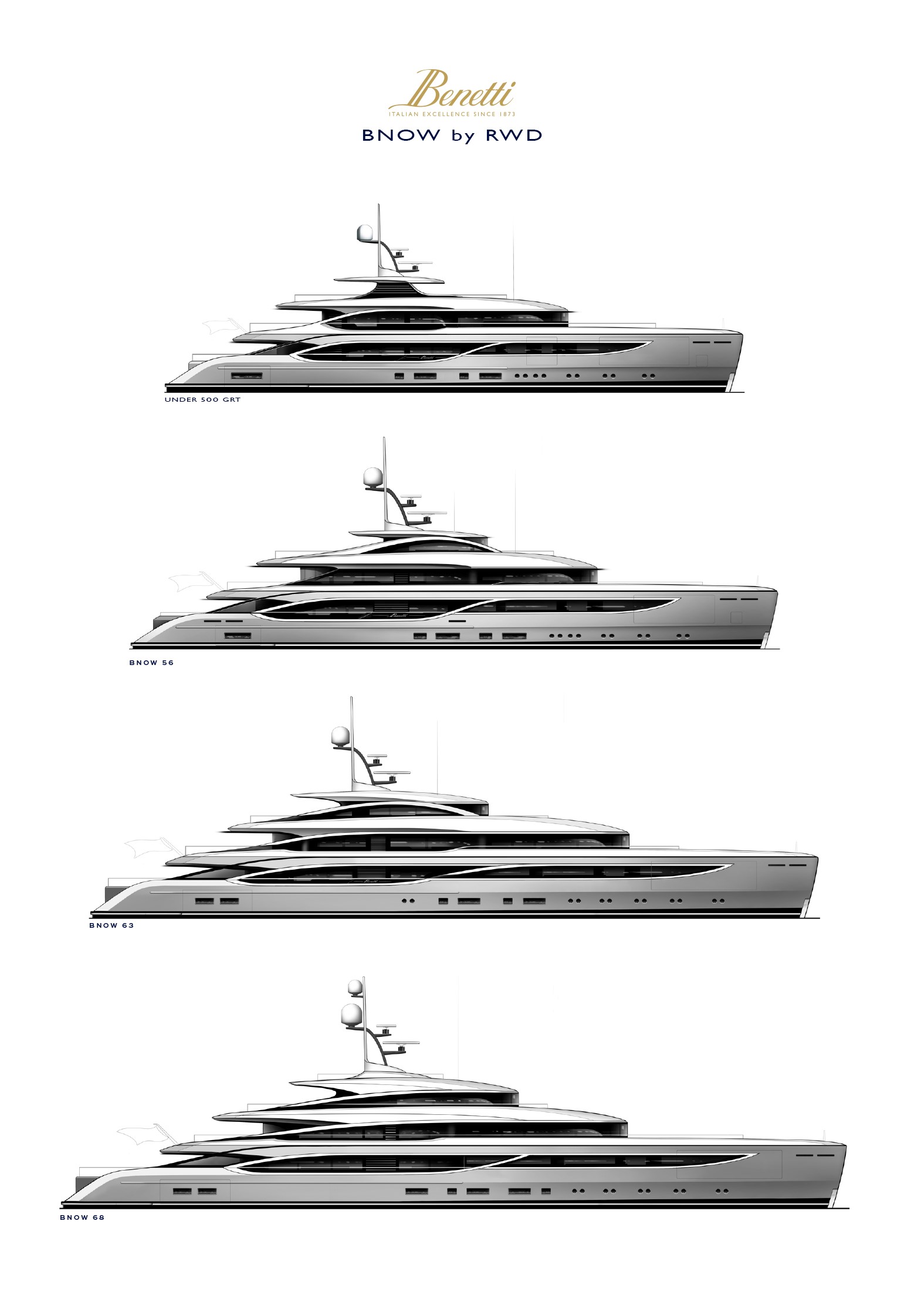 Benetti previews four new “BNow by RWD” models to be built at the Livorno shipyard with reduced delivery times.