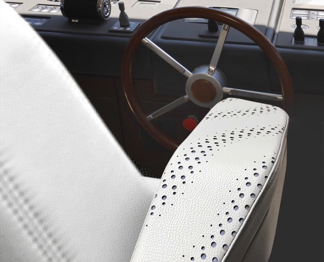 The idea of giving it a brand new look has guided the creative process more towards women’s haute couture than traditional nautical design; the linings, which perfectly adhere to the upholstery, have therefore given way to overlapping layers, folds and punctures evoking subtle tones of freshness, lightness and sinuosity. The use of materials, starting with leather, synonymous with elegance and exclusivity in the nautical environment, evokes the overlapping of layers and textures reminiscent of a dress. The colours range from ice grey, minimal and refined, to the blue of the water that will provide the natural context for this piece”.The leathers used by Marine Leather are specifically the Shark and the Sealskin ES, 100% real full-grain leather that perfectly combines aesthetics with maximum practicality and easy maintenance. In particular, the chrome-tanning process does not attract dust and is highly resistant to salt and stains. The colour can be applied according to the customer’s specifications and various creative processes can be applied such as laser and pleated inserts used for this special – “Unica” – pilot seat.