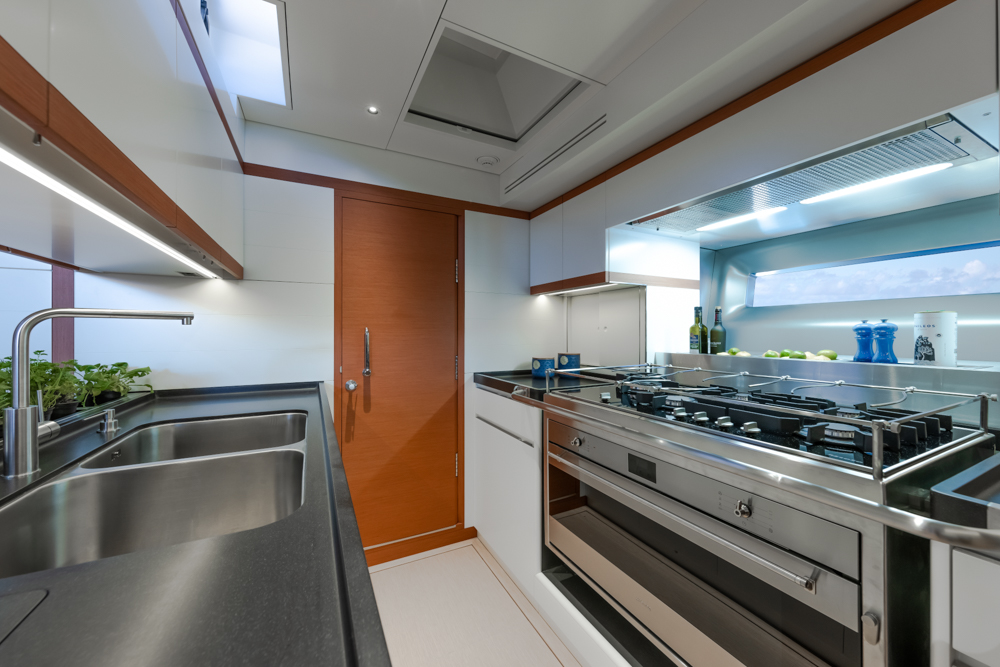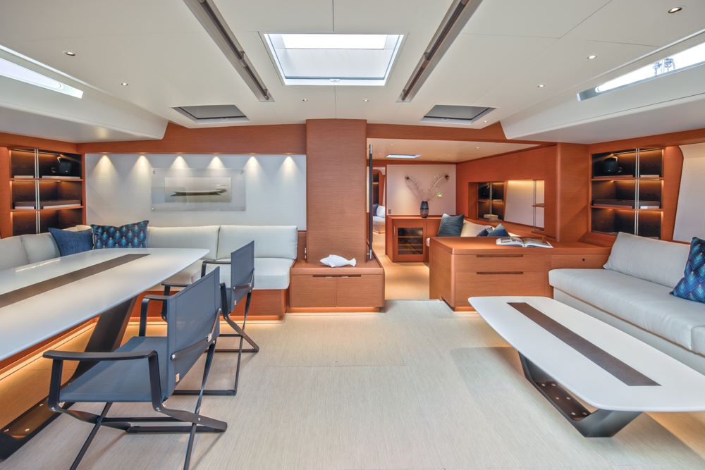 Morgana’s exterior profile, from the spacious flush deck to the sleek and sporty lines of the coachroof, is typical of the uncluttered style that Nauta Design brings to its projects. Thanks also to the tender garage, ample foredeck locker, hidden mooring arrangement and an underwater anchor system, the 100 footer’s clean and essential looks are the result of years of experience in designing ocean-going sailing yachts.