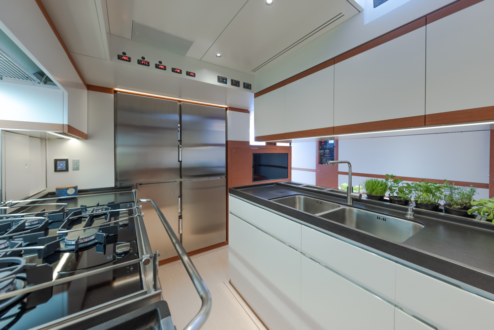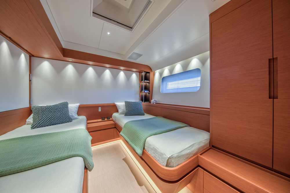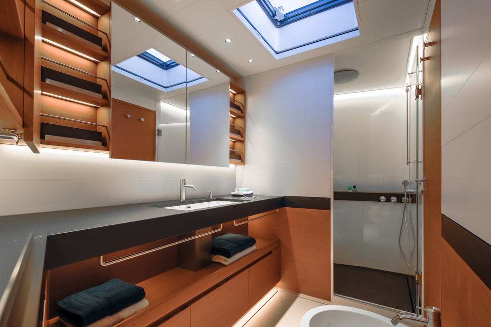 Nauta Design is also responsible for the fresh and contemporary yet understated interior styling. Morgana  has three en-suite guest cabins, including a large owner’s suite forward and a dedicated TV area in the forward part of the salon. The aft crew area includes a captain’s cabin with a double bed portside and a crew cabin with two bunks to starboard.