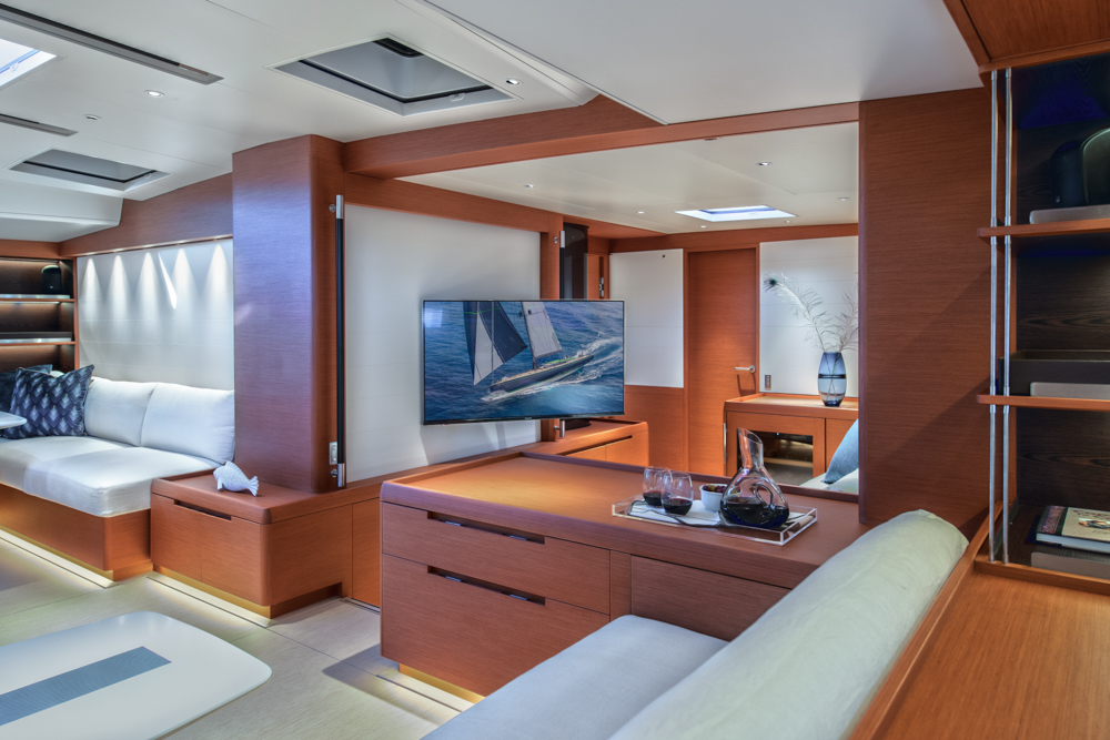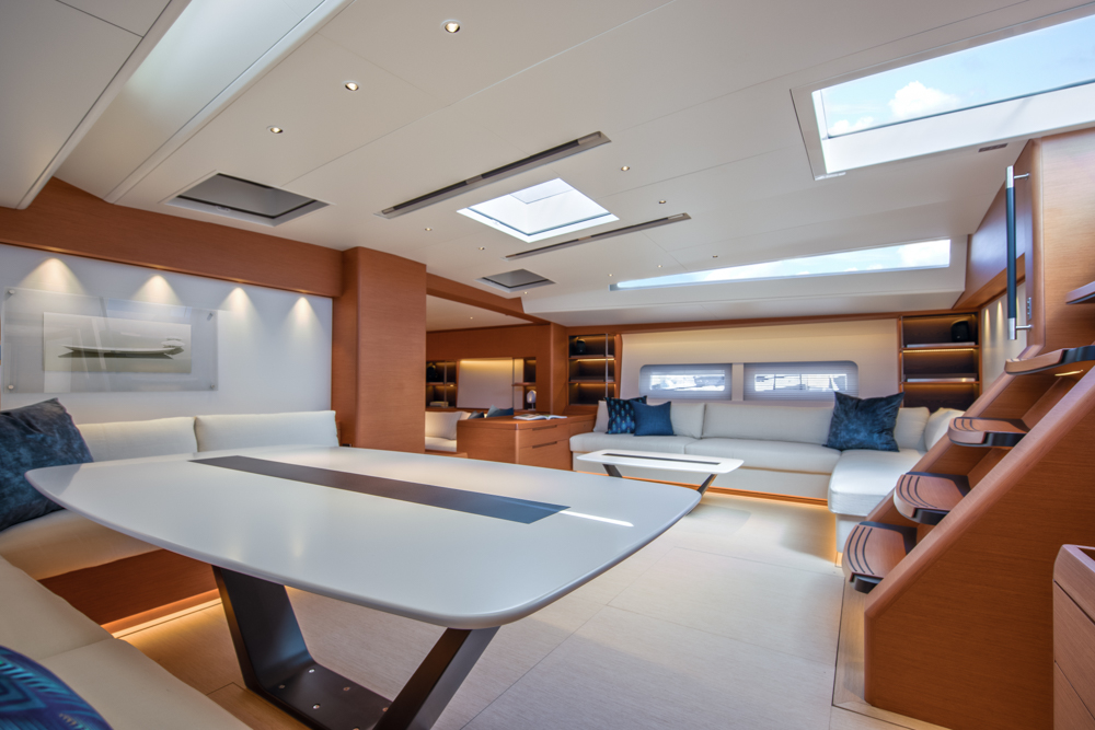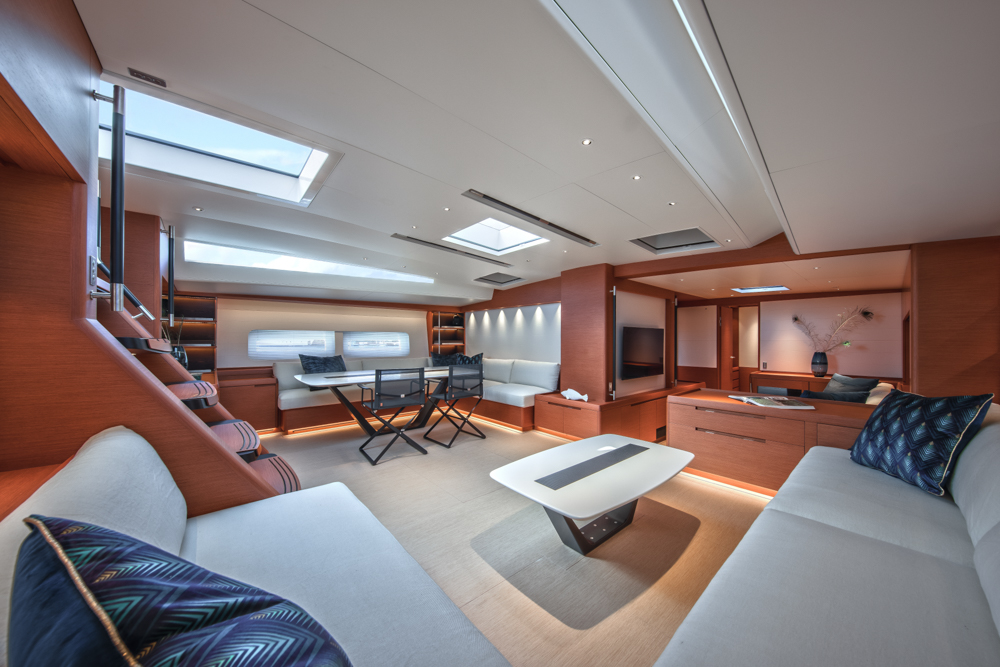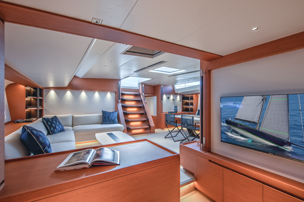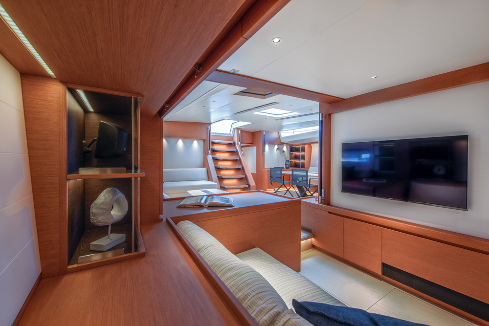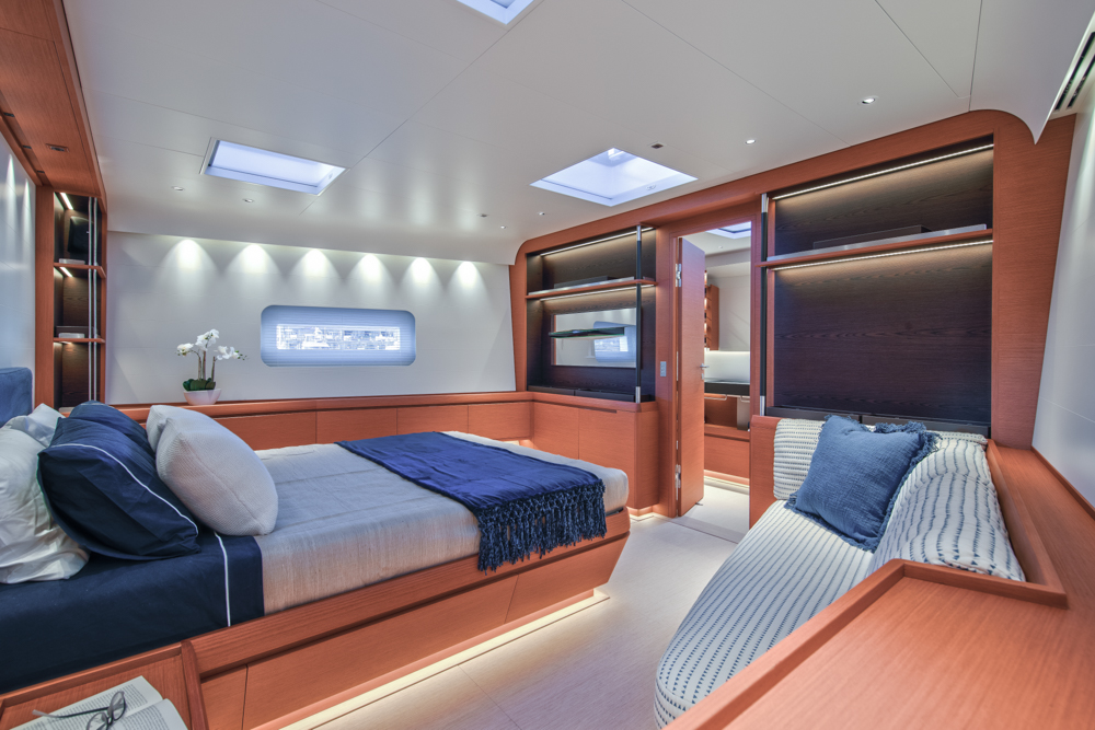 “Elegance and balance are the cornerstones of Nauta Design,” says  Massimo Gino, Nauta’s co-founder and partner. “The owner has a highly developed aesthetic sense and wanted a fast bluewater cruiser that could also compete in superyacht regattas with exterior lines that exude pace and performance, so we developed a low and very streamlined coachroof that is nonetheless proportionate to the height of the freeboard. On a lightweight boat like Morgana that has shallower underbody than comparable yachts, that meant we were playing with millimetres to get the right headroom and proportions.”