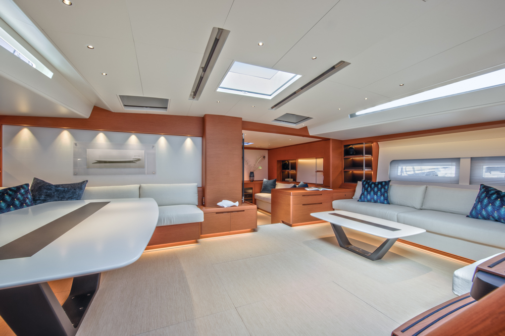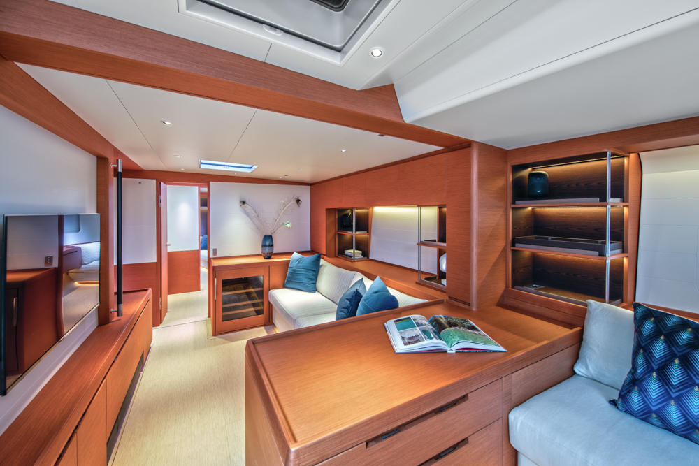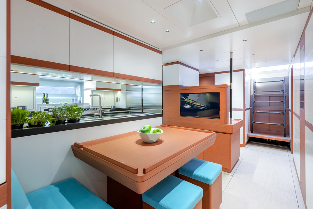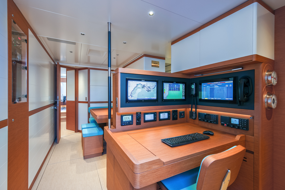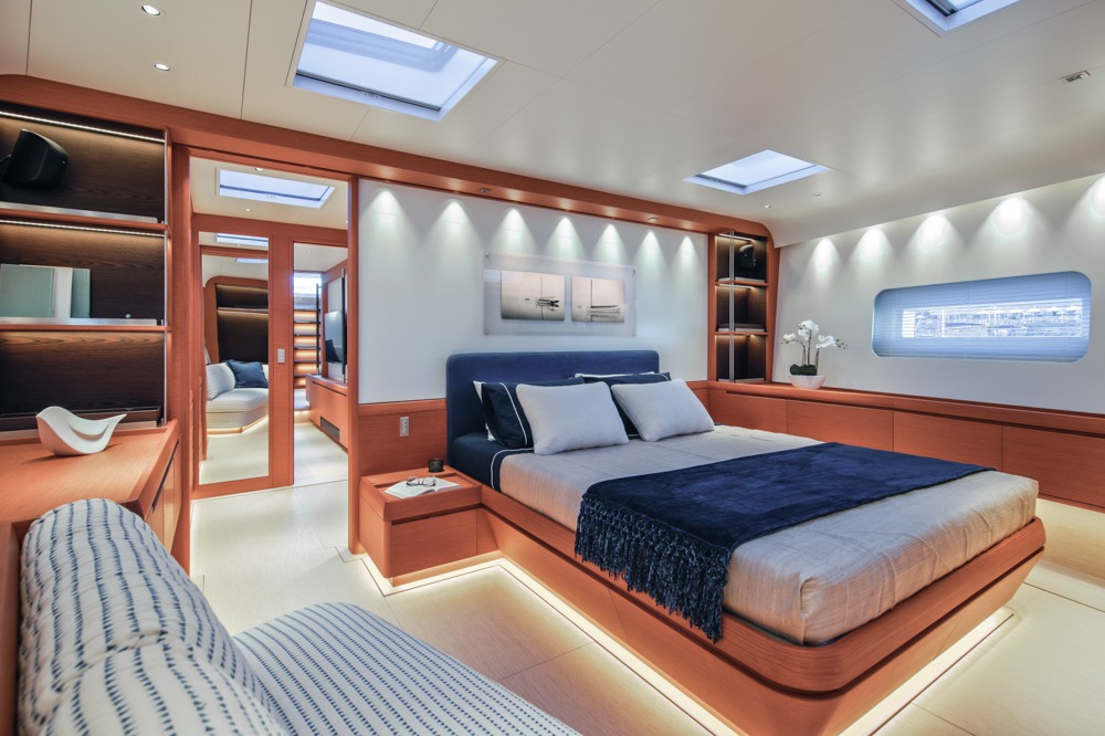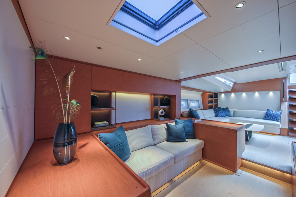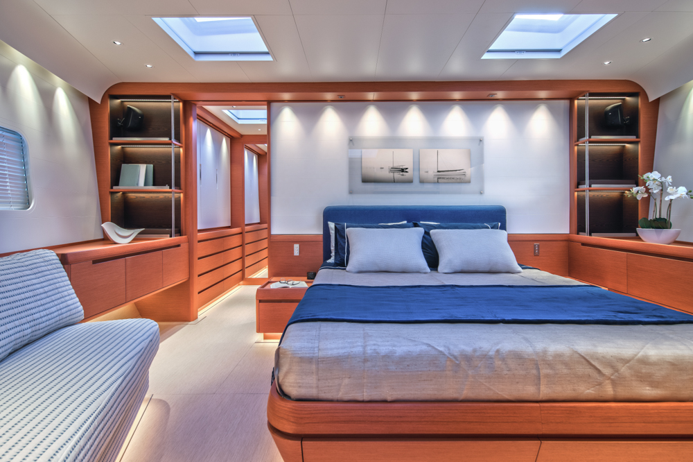 “Elegance and balance are the cornerstones of Nauta Design,” says  Massimo Gino, Nauta’s co-founder and partner. “The owner has a highly developed aesthetic sense and wanted a fast bluewater cruiser that could also compete in superyacht regattas with exterior lines that exude pace and performance, so we developed a low and very streamlined coachroof that is nonetheless proportionate to the height of the freeboard. On a lightweight boat like Morgana that has shallower underbody than comparable yachts, that meant we were playing with millimetres to get the right headroom and proportions.”