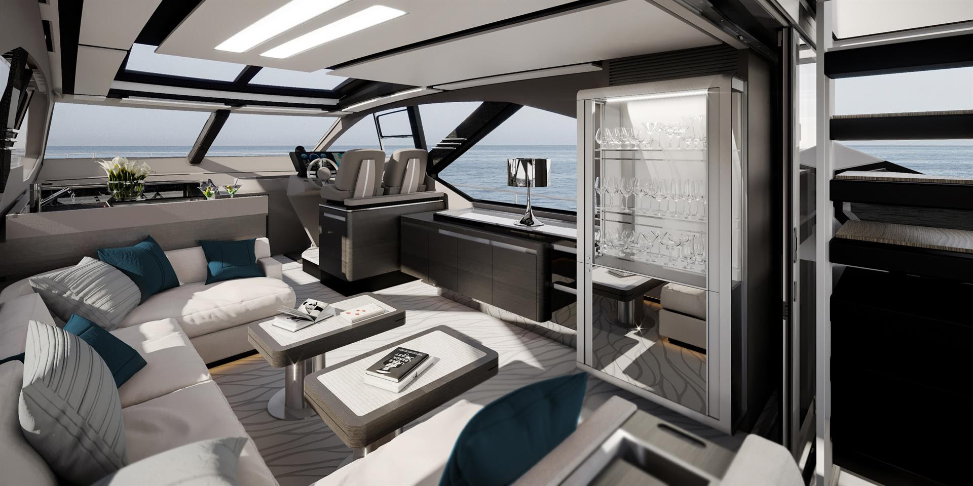 The exteriors designed by Stefano Righini propose the collection’s signature features, but they are joined by an unprecedented diamond-shaped deckhouse window, in a solution that gives the boat personality, while promising to amaze with its plays on reflected light.