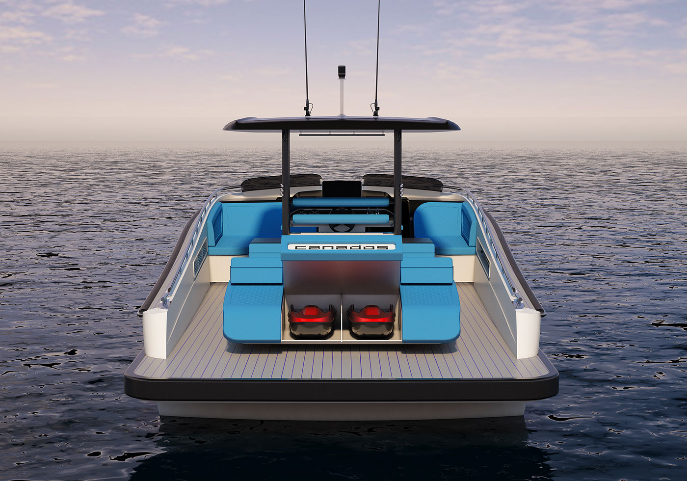 The center console configuration, protected by the standard carbon fiber hard-top is positioned in a way that allows installation of two face-to-face sofas. This configuration is a key element to social life as the owner operating his boat will be able to face his guests, friends or family while at the helm. Once anchored, the access to the foredeck is made via a central molded stairwell between the two Café Racer styled wind deflectors.