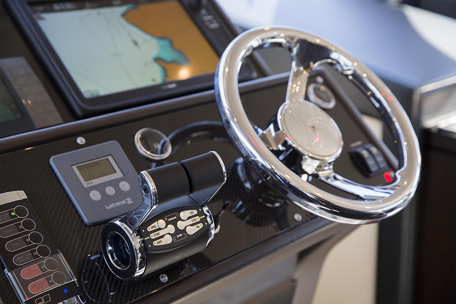 On specific request of the owner, the foredeck features a large sunbed and height-adjustable table to maximise the usability of this open-air space. The sunbed cushions can be raised to form a backrest, but both sunbed and accompanying table have been designed so as not to compromise the 80HT’s iconic profile when viewed from the side. The whole area can be shaded by a bimini supported on lightweight poles.