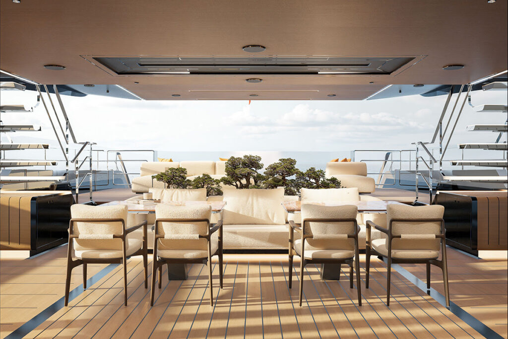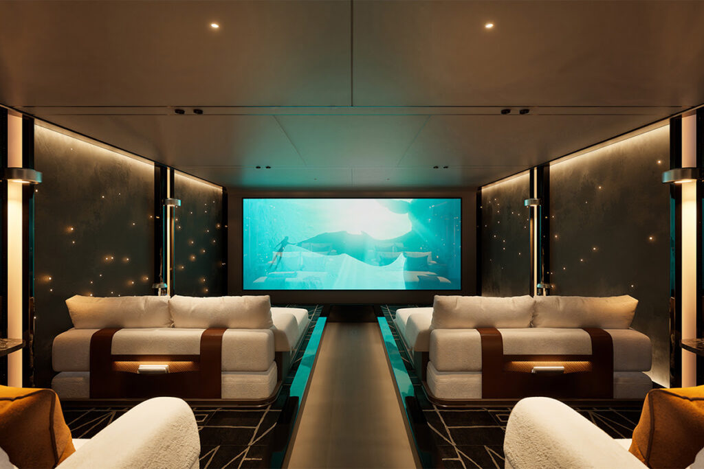 Six generous guest cabins on the lower deck, designed with refined materials, lighting and textures that strike a delicate balance between aesthetics and functionality, give direct access to the beach club and gym at the stern, elevating the ease of onboard living.