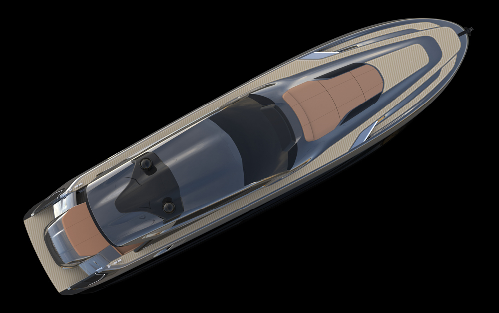 Conspicuous references to the automotive industry are the scooped air intakes in the hull and each side of the sunbed on the foredeck, as well in front of the windscreen and under the ‘manta-ray’ radar arch. These all channel air into the spacious engine room. The exhaust vents are cleverly integrated into glossy black grilles in the aft bulwarks either side of the swim platform and can be accented with strip LED lighting.