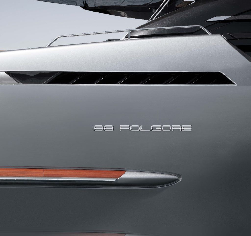 Built from composite materials, with carbon fiber reinforcements in the superstructure, Riva 88’ Folgore is entirely focused on efficiency, with a design developed specifically to embrace materials like marble, crystal glass and stainless steel, but without affecting performance. Turning to the design, the course set by Officina Italiana Design with the Dolceriva continues to hold true: the new design of the hull windows, reminiscent of a black brushstroke along the silver side of the yacht, rises towards the deck and meets an original and innovative hull-deck coupling system, where the stern area makes space for a steel-edged air intake.