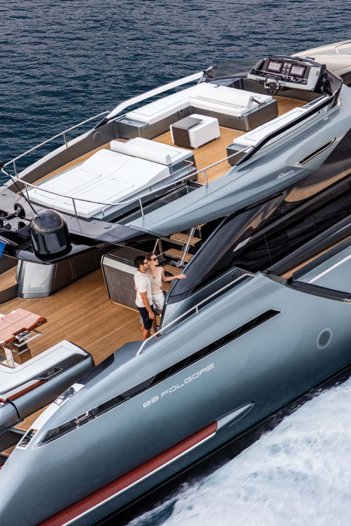 RIVA 88’ FOLGORE: FOREVER INNOVATIVE…Only Riva has the history, inventiveness, appeal and inspiration to create a boat that anticipates the future but is permeated by the evocative mood of tradition. The production and creative capacity of the shipyard, which has continued to maintain its stability and vitality in 2020, has been exploited to the full to realise a sport-fly of dazzling beauty, a groundbreaking mixture of style, technology and innovative materials.