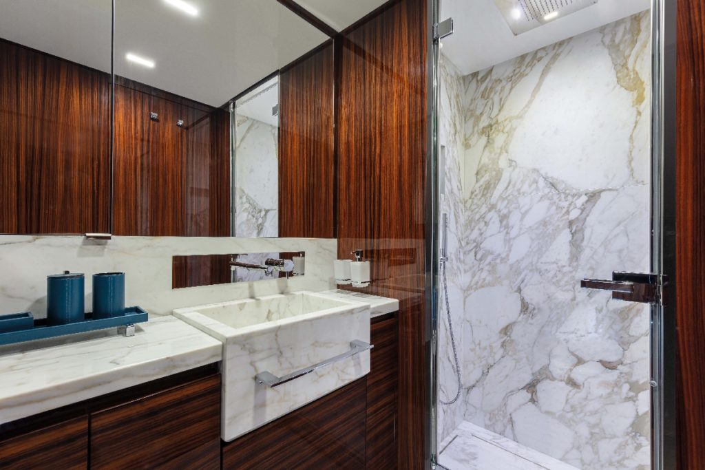 The lower deck offers the owner four cabins: the full beam owner’s suite in the centre of the yacht; a VIP cabin in the bow with a double bed and two wardrobes; a VIP cabin on the port side with a wardrobe and convertible twin beds; and a double cabin with a wardrobe and twin beds. They all have their own bathrooms. The starboard cabin’s bathroom also acts as a day head.