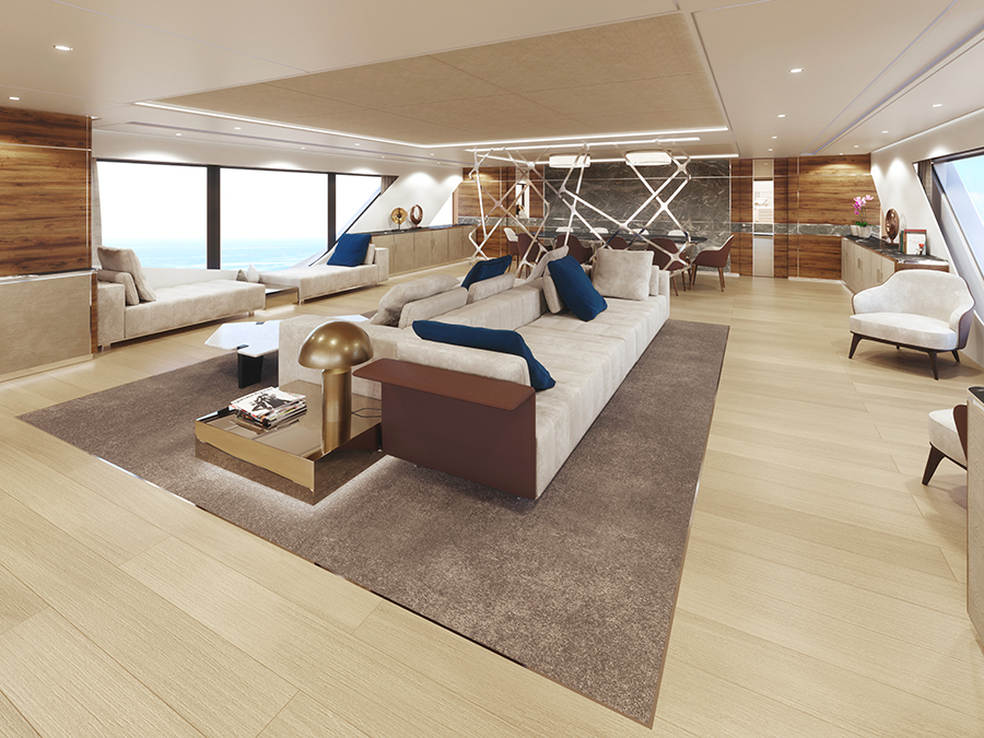 Lastly, on the sun deck, there is plenty of room to fit the dining area, which is connected to the galley through a food lift. An open-air cinema, with a folding screen, can be created in the forward section.