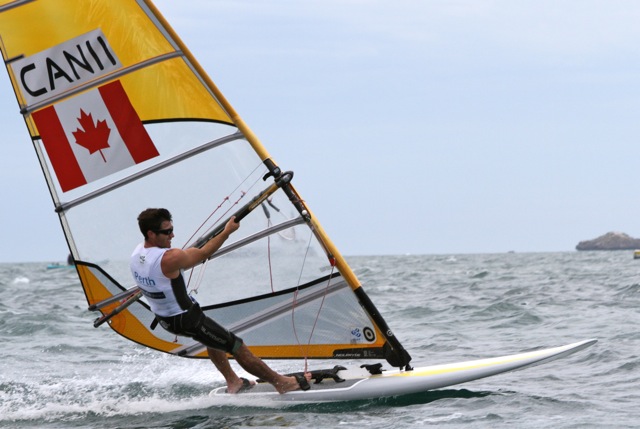 Beside these super racers, something very interesting is happening. New names are appearing in the top 10. Elliot Carney [GBR] long thought of as Nick Dempsey’s second string, popped in a 3rd an 8th to take 9th overall. Zac Plavsic [CAN] who has been training with Dorian and JP, smacked in a 4th and a 9th to claim 11th place. Robert Willis, The American Team Rep in the Pan Am Games, put in 2 top ten finishes in a class field. David Hayes [CAN] should not be forgotten either. With a 9th and a 12th on his scorecard tonight, he can be there when the scores are being counted to decide who competes in the medal race