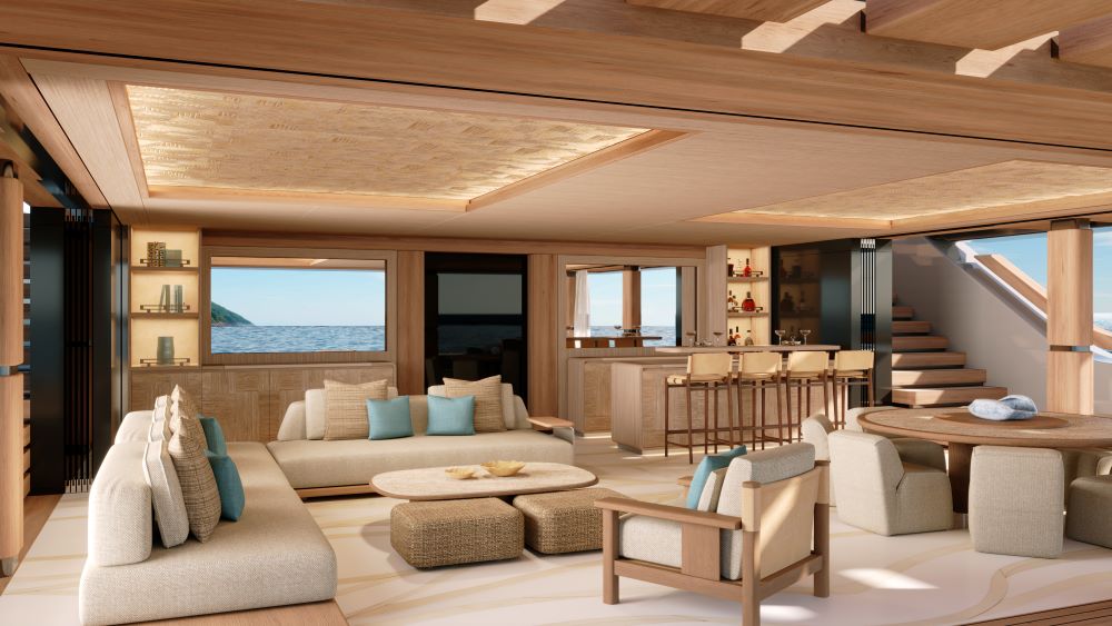 The warmth of natural teak and the balance of organic and geometric forms enhance the marine character while pushing aesthetic boundaries, giving the yacht its unmistakable identity.