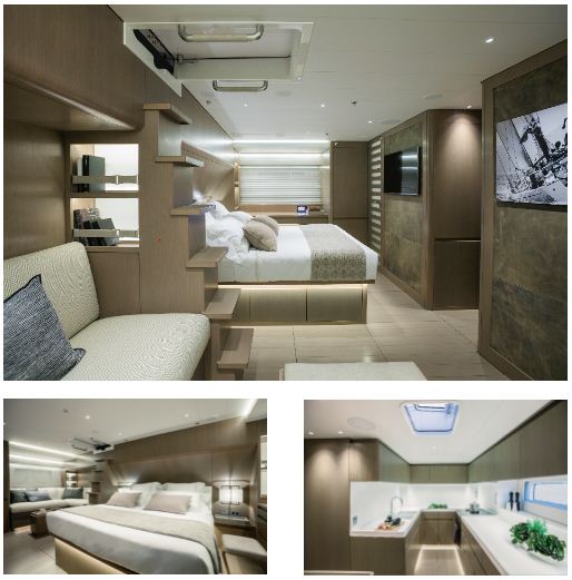 The general arrangement places the owner´s cabin aft using the wide hull shape to create a beautiful full-beam stateroom with centerline berth, lounge sofa to starboard and desk on port. A private deck companionway is also a key feature. There are leather upholstered niches on the forward bulkhead providing symmetrical placement for TV and artwork.