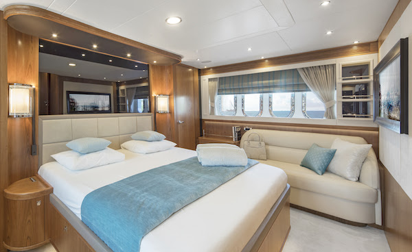 Typified by a classical nautical ambience, the robust and practical interior is executed predominantly in cherrywood. The main deck has a wide exterior area aft that centres on a lovely dining table. The saloon includes a nook with a dinette focused on an extendable table. Halfway inside, the floating spiral staircase leading up to the flybridge has a delicate see-through structure that prevents it from blocking lines of sight. Doors on either side open onto the gangways. The galley to starboard is very well-equipped with all conceivable appliances and gadgets. An indoor steering position to forward is flanked on the starboard side by a cosy hangout space for guests who enjoy watching the action at the helm.